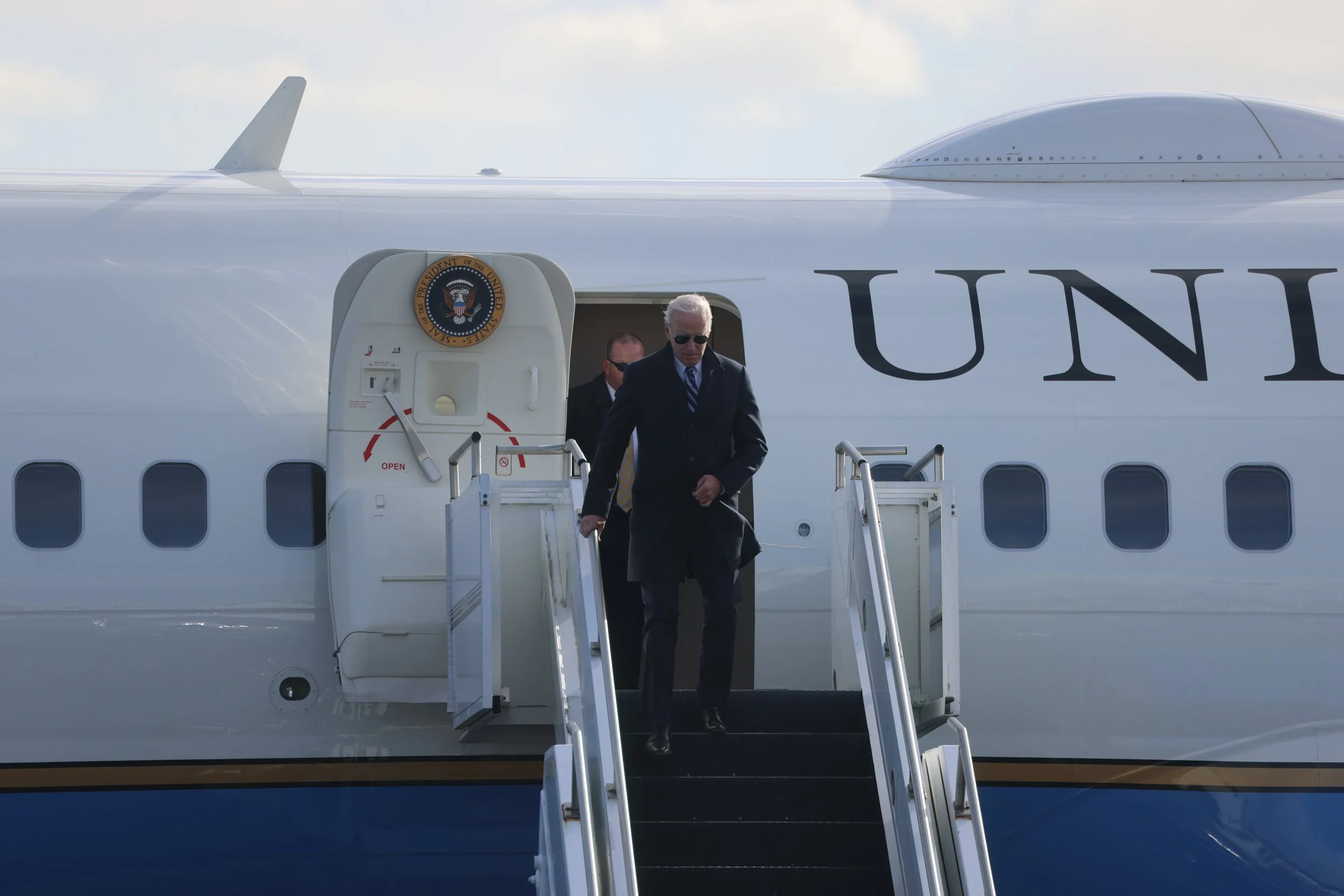 President Biden descends the staircase of Air Force One upon lading at Philadelphia International Airport’s Atlantic Aviation in Philadelphia on February 3, 2023 (Andrew McKeough/AKSM Photography).