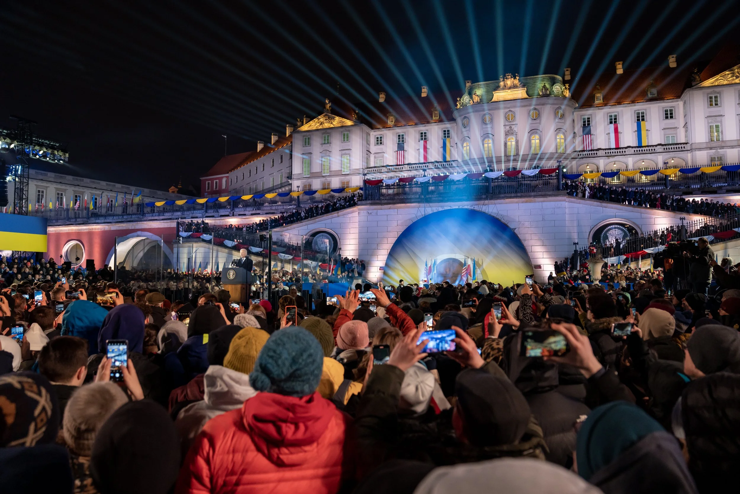 President Biden delivers remarks in Warsaw’s Kubicki Arcades to a crowd of 30,000 people just hours after Russian President Vladimir Putin said he would suspend participation in a nuclear arms control agreement with the United States (Official White House Photo by Adam Schultz).