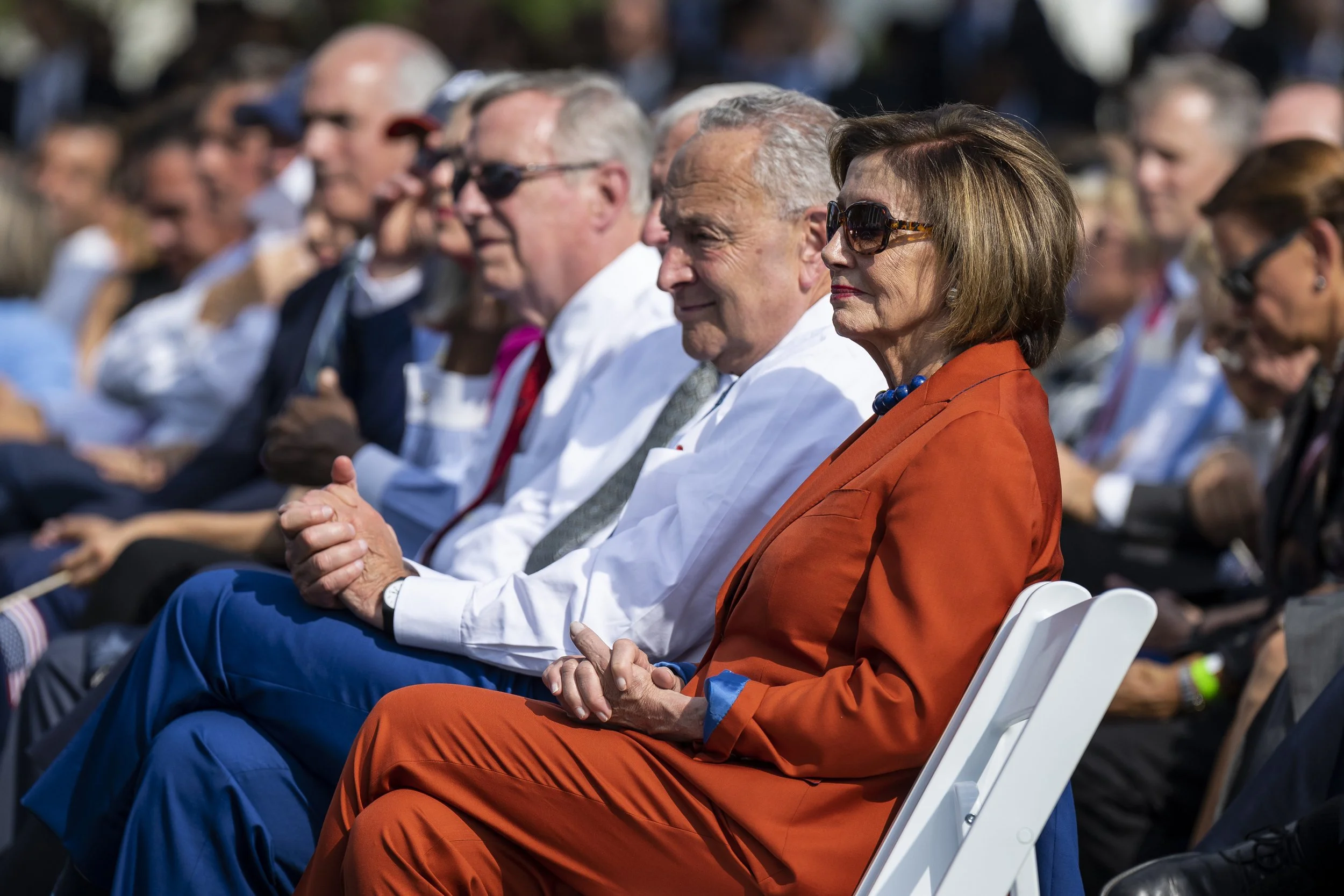 House Speaker Nancy Pelosi (D-Calif.) and Senate Majority Leader Chuck Schumer (D-N.Y.) listen as IBEW union member Lovette Jacobs delivers remarks and introduces President Joe Biden at the celebration event for the Inflation Reduction Act, Tuesday, September 13, 2022, on the South Lawn of the White House. (Official White House Photo by Adam Schultz)