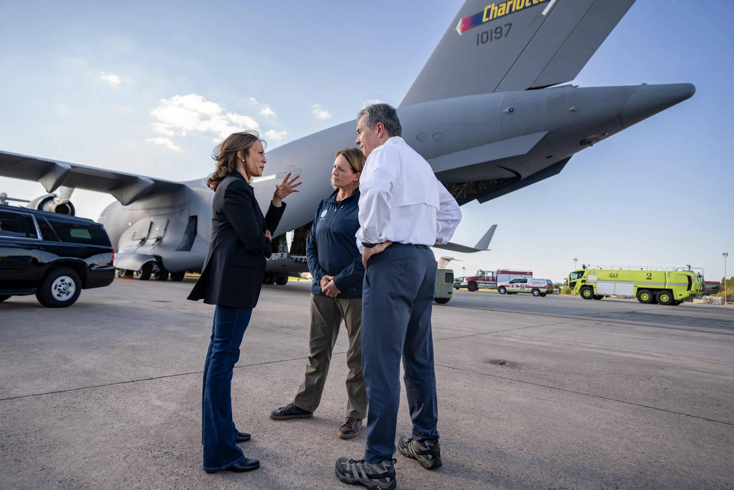 Vice President Kamala Harris speaks with FEMA Administrator Deanne Criswell and Gov. Roy Cooper (D-NC), Saturday, October 5, 2024, at Charlotte Douglas International Airport in Charlotte, North Carolina (Official White House Photo by Lawrence Jackson).