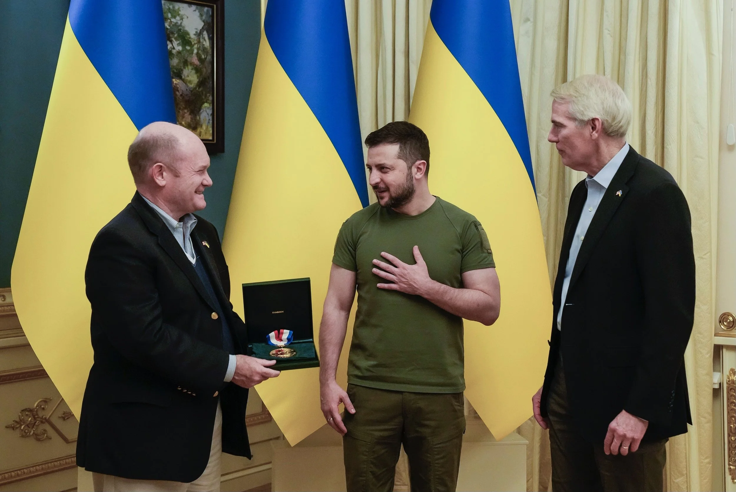 Delaware senator Chris Coons (left) and Ohio senator Rob Portman (right) present Ukrainian President Volodymyr Zelenskyy with the 2022 Liberty Medal at the Mariinskyi Palace in Kyiv, Ukraine (Courtesy of the National Constitution Center).