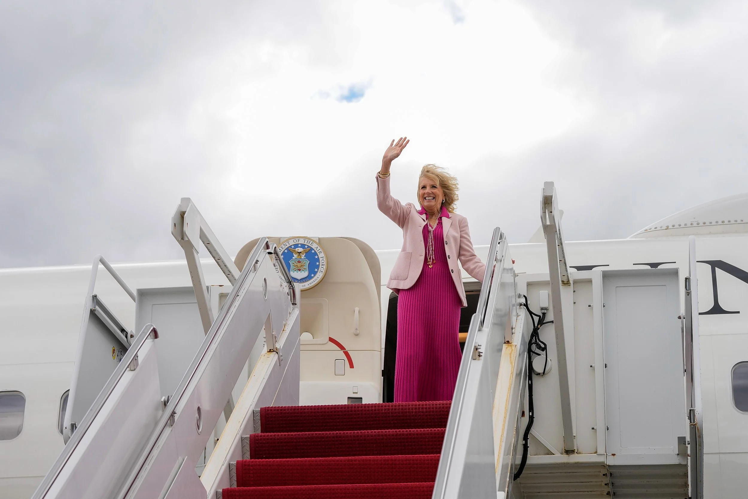 First Lady Dr. Jill Biden waves from the top of the staircase of Executive Foxtrot One as she prepares to depart from Joint Base Andrews en route to London Stansted Airport ahead of Coronation festivities (Official White House Photo by Erin Scott).